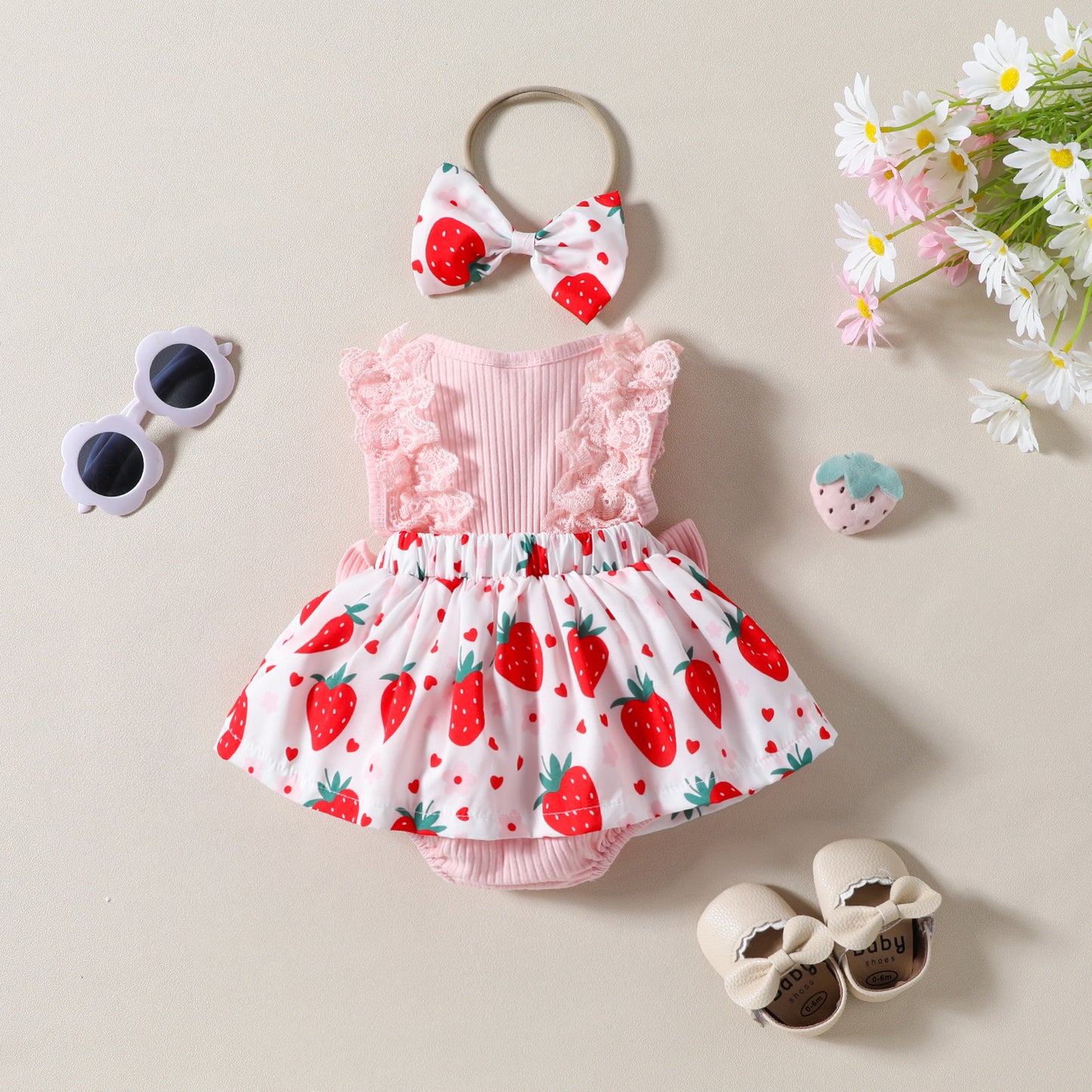 Infant Toddler Strawberry Print Bow Sleeveless Summer Romper