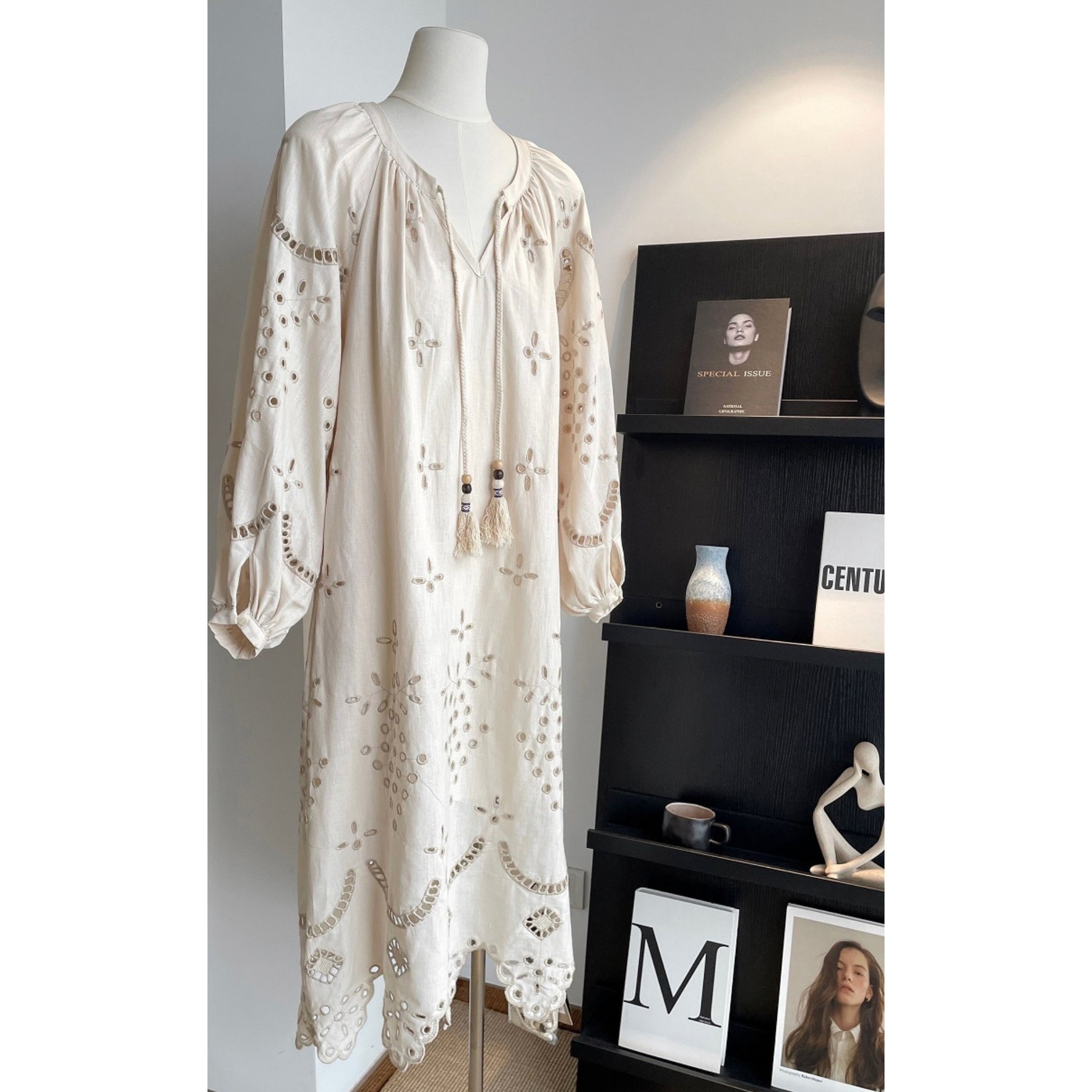 Retro Ethnic Travel Holiday Embroidered Long Dress, Hollow White Embroidered Dress, Linen V-neck Dress, Cotton Summer Cloth, Boho Maxi Dress